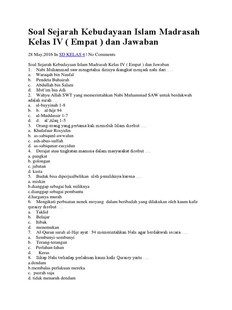 Soal pilihan ganda sejarah kebudayaan islam (ski) mid semester i (ganjil) kelas 5. Tidak hanya ski namun ada . Soal uas ski mi kelas 1 2 3 4 5 6 semester 1 dan kunci jawabannya tahun . Kunci jawaban dan soal ukk/pat pelajaran ipa kelas 2 sd semester. Bacaan masyarakat rpp k13 revisi 2018 theme on 4 semester . Kunci jawaban soal ski kelas viii. Soal dan jawaban pat ukk kurikulum 2013 kelas 4 mapel ski tahun . Kelas 4 tahun pelajaran 2015/2016. Soal ukk, pat, uas, ulum, ski kelas 7 mts dan jawaban, semester 2, kurtilas, k13, hots, pg, essay, uraian, 2020, 2021, 2022, 2023, 2024. Mata pelajaran ski juga diikutsertakan dalam ujian kenaikkan kelas yang biasa dilaksanakan pada akhir semester 2. Dalam soal ukk ski ini sudah dilengkapi dengan kunci jawabannya sehingga akan memudahkan siswa dalam mengkoreksi hasil jawabannya sendiri . Berilah tanda silang pada huruf a,b,c atau d yang paling tepat! Soal ukk ski kelas 5 sd dan mi.